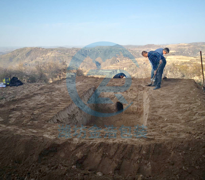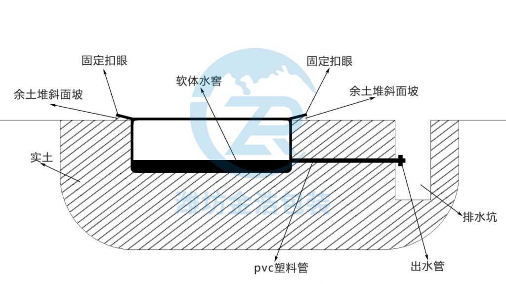 根據現場(chǎng)環(huán)境,選取場(chǎng)地,按安裝規格選址放線(xiàn),放線(xiàn)尺寸比軟體水窖尺寸小5cm。